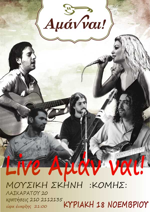Οι Αμάν ναι! εμφανίζονται την Κυριακή 18 Νοεμβρίου στις 21:00, στον Κόμη (Λασκαράτου 20 Πατήσια) σε ένα νέο πρόγραμμα με Ethnic χαρακτήρα. Ένα μουσικό ταξίδι, που παντρεύει την παράδοση με τον ηλεκτρικό ήχο, στα Βαλκάνια την Ισπανία αλλά και στο πολιτικό σκηνικό της Ελλάδας με εμπνευσμένες διασκευές σε Ελληνικό και ξενόγλωσσο στίχο.