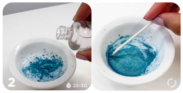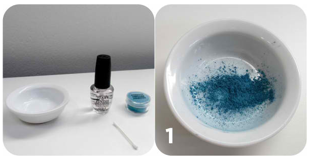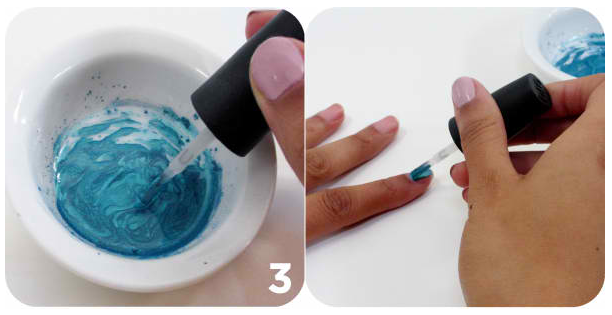 Ρίξτε 25 με 30 σταγόνες απο το διαφανές βερνίκι νυχιών και ανακατέψτε τα με μία μπαντονένα απο την οποία έχετε αφαιρέσει πρώτα το βαμβάκι. Αν δείτε ότι το μίγμα είναι πολύ πυκνό ή αραιό συμπληρώνετε αναλόγως. Όσο πιο καλά ανακατέψτε τόσο πιο ομοιόμορφα θα απλωθεί το μίγμα στα νύχια σας.